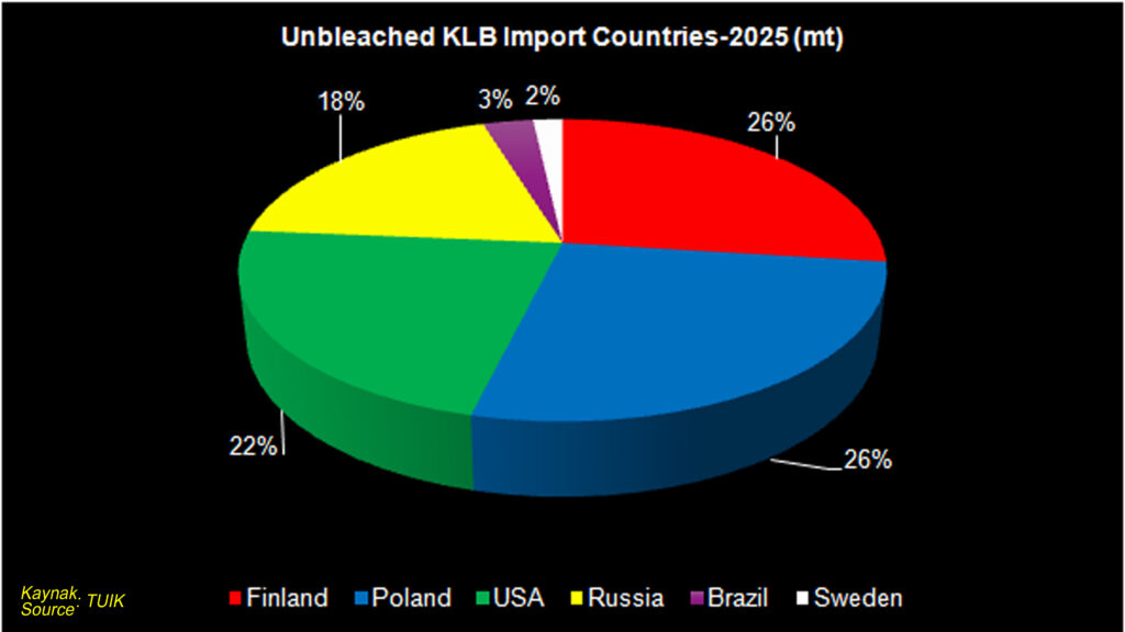 Oluklu mukavva üretiminde kritik öneme sahip kağıtlardan birisi olan kraftliner için, 480411 istatistik pozisyonunda tarif edilen (Birincil elyaf [kraft] kağıt ve kartonları / Kuşesiz / Beyazlatılmamış) başlığı altında 2025 yılında yapılan ithalatta, Finlandiya, küçük bir miktar farkına rağmen, Polonya ile birlikte liderliği almış olup, onu sırasıyla ABD, Rusya, Brezilya ve İsveç takip etmektedir. Yukarıda belirtilen altı ülkeden yapılan ithalat, 2025 yılındaki toplam kraftliner ithalat miktarının yaklaşık %97’ni oluşturmaktadır.